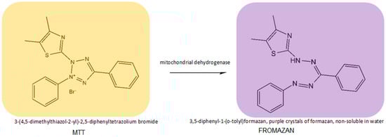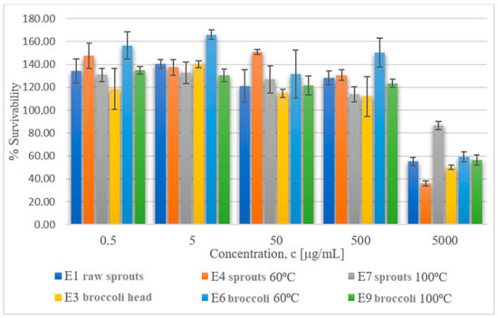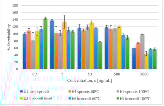 After 48 h, 10 µL of the MTT TOX1 set was added to each well and stirred. After 3.5 h of incubation at 37 °C, the medium was carefully removed, and isopropanol solution was added to dissolve the formazan crystals that had emerged. Absorbance was read for following wavelengths: 570 and 620 nm for background with a microplate reader (Multiskan, ThermoFisher). All tests were made in triplicate, and the relative cell viability (IC50) was calculated. The MTT cytotoxicity test was performed for the following samples: E1—raw broccoli sprouts; E3—raw broccoli head; E4—broccoli sprouts processed at 60 °C; E6—broccoli head processed at 60 °C; E7—broccoli sprouts processed at 100 °C; and E9—broccoli head processed at 100 °C.