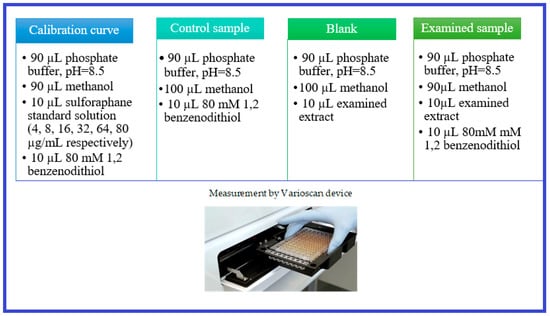 In order to determine isothiocyanates in the analyzed extracts, a standard solution of 1,2-benzenedithiol at a concentration of 80 mM was prepared. To this end, 114.2 mg of the standard reagent was dissolved in 10 mL of methanol. The analysis was carried out on a 96-well plate. The reaction mixture with the ultimate volume of 200 µL was prepared in the following way (