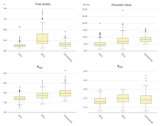 UV spectrophotometric indices: The legal limits of the K232 and K270 for the EVOO commercial category [8] are 2.50 and 0.22, respectively. The values indicate oil secondary oxidation level and any formation of conjugates trienes due to refining processes. They can increase over storage time but, differently from the peroxide value, they cannot decrease. The experimental data (Table 1) showed that none of the 2013 samples overcame the limits for the EVOO category, that 2.6% of the 2014 samples overcame both the K232 and K270 limits, and that 5.4 and 2.7% of the commercial samples overcame the K232 and K270 limits, respectively. The boxplots in Figure 1 point out that the values of K232 were the lowest for the 2013 samples, with a mean value of 1.73, and that the greatest values were for the 2014 samples (1.89) and for the commercial samples (2.01). The values of K270 were still the lowest for the 2013 samples (mean, 0.13), but with smaller differences in comparison to the 2014 samples and the commercial samples (0.16 and 0.15, respectively). Summarizing the above experimental data, we can state the following:
