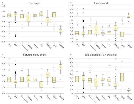 The variability of both the above three components and the linoleic acid for the 2013, 2014 and commercial samples is shown in the boxplots in Figure 2, whereas Table 2 shows the percentage of oils within specific ranges of the components. Overall, a very negligible number of oils showed values out of the limits for the EVOO category for all the fatty acids. The oleic acid was more affected by geographic origin than by adverse effects such as olive fly attacks. It exhibited highest values in the Italian, Greek, and Spanish samples, followed by the Australian and Portuguese ones, while the Tunisian oil exhibited much lower percentages of this acid. A fairly opposite behavior was observed for linoleic acid. The saturated fatty acids exhibited a high variability among the classes, with the highest and the lowest values being in Tunisian and Italian oils, respectively. The ratio OA/(LA + 2 × LnA) showed the lowest values for the Tunisian samples, while the Spanish oils were those with the highest mean values, but they also showed a high variability. Summarizing the above experimental data, we can state the following: