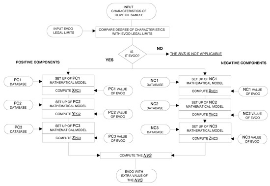 Figure 4 shows the flow chart of the algorithm for the EVOO NVS. The algorithm starts with the comparison of the chemical and sensory characteristics degree of the sample with the legal limits (see paragraph 2.1); if only one of these characteristics is not-conforming, the sample is excluded from the NVS. Then, the algorithm computes the dimensionless values of the positive and negative chemical components of Equation (1), which is described in Section 3.1. The above dimensionless values resulted from mathematical models, which were based on the components databases previously described in terms of percentages of samples within specific ranges of the considered parameters. The mathematical models were linear and non-linear equations designed on the basis on the percentage of samples with specific range of values as reported in Table 1, Table 2 and Table 3 and having as boundary conditions either the legal limits or specific values selected on the basis of the data in Table 1, Table 2 and Table 3. Via this method, for example, in the case of free acidity, the maximum negative contribution was already reached at values well below the legal limit, as this value (i.e., 0.8%) is only rarely reached when strong olive fly attacks occur (see in Table 1) and the non-linear equation was designed to give an increasingly negative score to the NVS following the values of percentage of samples with specific ranges (Table 1).