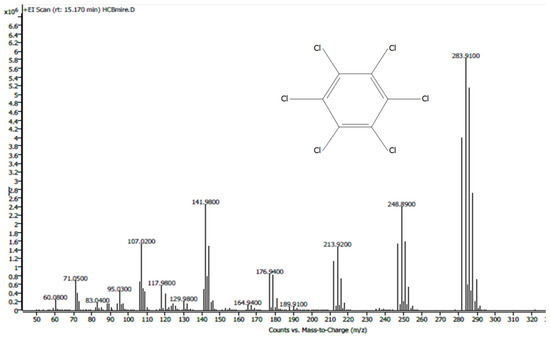 HCB was determined with a mass spectrum histogram (analysis in SCAN MS mode; Figure 2). To quantify the pesticide, the actual samples and calibration standard solutions were applied in the Selected Ion Monitoring (SIM) mode of the mass spectrometer (target ion [m/z] 283.9; confirmation ions: 248.9; 141.9). Each sample was analyzed three times.