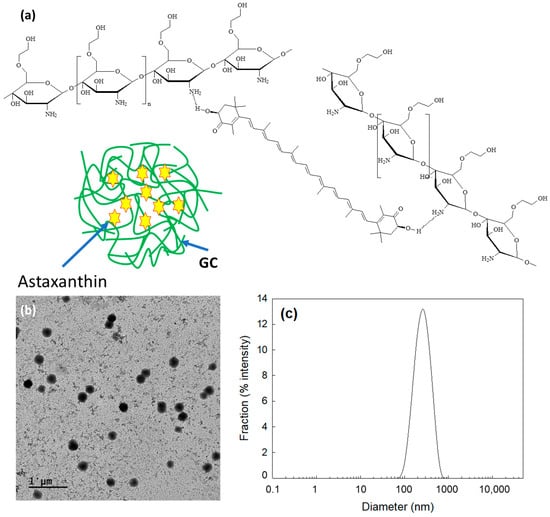 The morphology of AST-GC nanoparticles was observed using transmittance electron microscopy (TEM, JEM 2000 FX II, JEOL Ltd., Tokyo, Japan). The ChitoAST nanoparticle solution was mixed with a 2% (w/v) phosphotungstic acid solution and then dropped onto a copper grid coated with a carbon film. After the sample was dried at room temperature, the TEM observation was performed at 80 kV.
