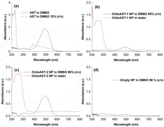 UV spectrum of AST and ChitoAST-2 nanoparticles. (a) AST in DMSO. AST (10 μg/mL in DMSO or DMSO/water mixtures (1/9, v/v). (b) ChitoAST-1 nanoparticles (ChitoAST-1 NP) in DMSO/water mixtures (9/1, v/v) or water. (c) ChitoAST-2 nanoparticles (ChitoAST-2 NP) in DMSO/water mixtures (9/1, v/v) or water. (d) Empty nanoparticles (Empty NP, Chito only) in DMSO/water mixtures (100 μg/mL in DMSO/water mixtures (9/1, v/v)).