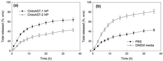 AST release from ChitoAST nanoparticles. (a) The effect of drug content; (b) The effect of media on the drug release characteristics (ChitoAST-2 nanoparticles).