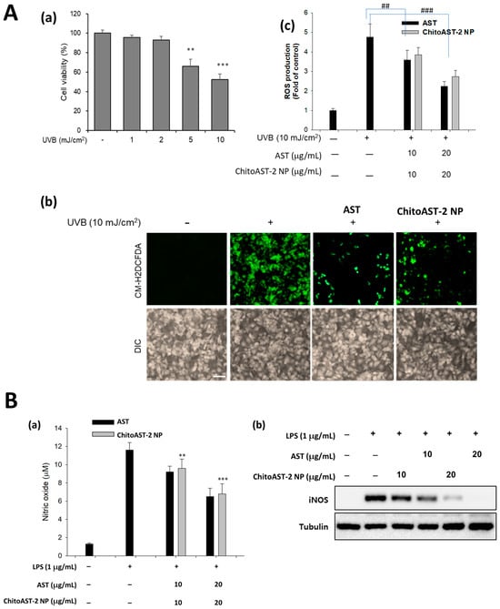 (A) (Aa) The effect of UVB irradiation against B16F10 cells. The effect of ROS scavenging effect of AST or AST released from ChitoAST nanoparticles (ChitoAST-2 NP) against UVB-irradiated B16F10 cells: (Ab) Fluorescence images of cells (bar = 100 µm); (Ac) Comparison of intracellular ROS levels. **, ***: p < 0.01. (B) (Ba) Inhibitory effects of AST or AST released from ChitoAST-2 nanoparticles (ChitoAST-2 NP) on nitric oxide production and (Bb) iNOS expression of RAW 264.7 cells. To study the effect of astaxanthin or astaxanthin released from ChitoAST-2 nanoparticles on the production of nitric oxide, cells were stimulated with LPS (1 μg/mL) for 24 h in the presence of AST or ChitoAST-2 NP. Results are expressed as percentages compared to the respective values obtained for the control. Data represent the mean ± SD over three separate experiments. ##, ### p < 0.01 vs. the control group; ** p < 0.01, *** p < 0.001 vs. the LPS-treated group.