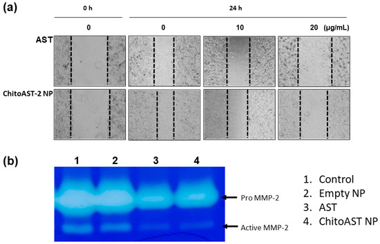 (a) Wound healing assay and (b) gelatin zymography of B16F10 cells. B16F10 cells were treated with AST or AST released from ChitoAST-2 nanoparticles (ChitoAST-2 NP). Dashed lines in wound healing assay indicated the migration of cells from 0 h to 24 h.