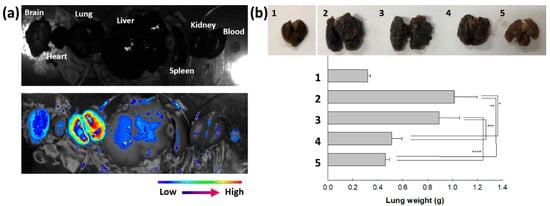 Pulmonary metastasis model of B16F10 cells for evaluation of targetability of ChitoAST-2 nanoparticles (ChitoAST-2 NPs). (a) Fluorescence images of each organ. (b) Comparison of lung weight. 1. Normal lung; 2. PBS; 3. Empty nanoparticles; 4. AST; 5. ChitoAST-2 NPs. For empty nanoparticles, Chito was intravenously (i.v.) administered. *, **, ***, ****: p < 0.01 For pulmonary metastasis of B16F10 cells, 5 × 105 cells/0.1 mL PBS were administered intravenously (i.v.) via tail vein of nude BALb/C mice. Fluorescence dye-conjugated ChitoAST-2 nanoparticles (ChitoAST-2 NPs) were administered via tail vein of nude BALb/C mice. 1 day later, mice were sacrificed to observe fluorescence intensity of each organ, which reflects biodistribution of nanoparticles.