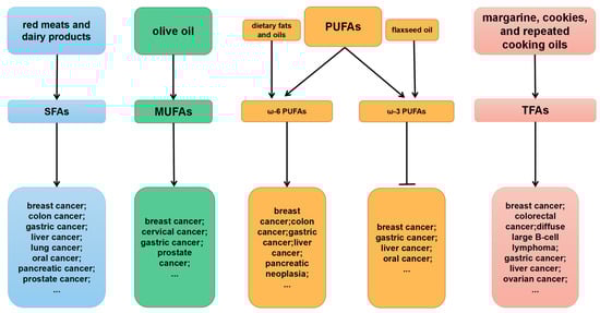 An overview of the relationships among SFAs, MUFAs, PUFAs, and TFAs with cancer is shown in Figure 1. Above all, the intake of fatty acids has an essential impact on tumor occurrence, invasion, and metastasis. Therefore, a moderate intake of fatty acids is of great significance for preventing and improving cancer prognosis.