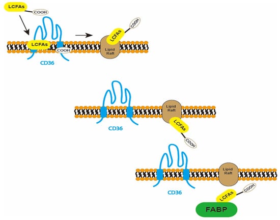 CD36, an extensively glycosylated 80 kDa integral membrane protein, is expressed in a variety of cell types, including platelets, monocyte phagocytes, adipocytes, hepatocytes, myocytes, and certain epithelial cells. CD36 is sometimes called GPIV, GPIIIb, PAS IV, or FAT [43]. CD36 belongs to the scavenger receptor B class 2 (SR-B2) and is a transmembrane glycoprotein with two short intracellular domains, two transmembrane segments, and a large extracellular region [89]. Its intracellular C-terminus can bind to tyrosine kinase and initiate CD36-mediated signaling [43]. CD36 binds and internalizes long-chain fatty acids (LCFAs), and oxidizes low-density lipoprotein (oxLDL), thrombospondin-1, and pathogen-associated molecules. Its extracellular structural domain can bind to CD36-related ligands, such as lipid-associated ligands. LCFAs enter cells and serve as a source of energy, with a carboxyl group and a methyl group present at each end of their molecular structure. As Figure 3 shows, CD36 mediates the uptake of cellular LCFAs in three steps. The first step is extracellular uptake, where CD36 serves as a fatty acid receptor that binds the corresponding LCFAs and connects them to specific lipid raft structures on the plasma membrane. The second step is translocation, where the polar carboxyl groups of fatty acids flip from extracellular to intracellular through the lipid bilayer and relocate. The third step is desorption, where fatty acids enter the cytoplasm from the internal binding site of the plasma membrane and bind specifically to fatty acid-binding proteins (FABPs) [90]. FABPs are a group of intracellular proteins that have the ability to bind and transport fatty acids within cells. These proteins play a crucial role in cellular metabolism by binding to free fatty acids and facilitating their transport to specific organelles or enzymes for further breakdown and utilization. Through their binding and transport functions, FABPs help to regulate the metabolism of fatty acids and ensure their efficient utilization within the cell.