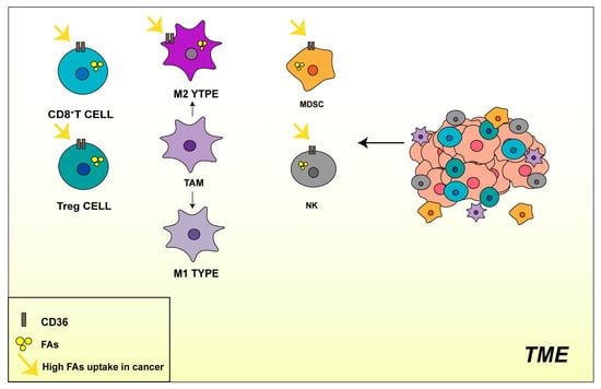 However, in contrast to tumor cells, the expression of CD36 is downregulated in tumor microvessels and stroma [94]. For example, high mammographic density (MD) is a significant risk factor associated with an increased incidence of breast cancer, and high MD (but cancer-free) tissue shows reduced levels of CD36 [113]. Therefore, CD36 has different effects on tumor cells and cells in the tumor microenvironment (TME). TME, the site of tumorigenesis and growth, is a complex ecosystem of multiple cellular components, including many endothelial cells, fibroblasts, immune cells, and malignant cells [114]. The functions of immune cells are critical to tumorigenesis. In the next section, our focus will be on examining the impact of CD36 on immune cells within the TME.