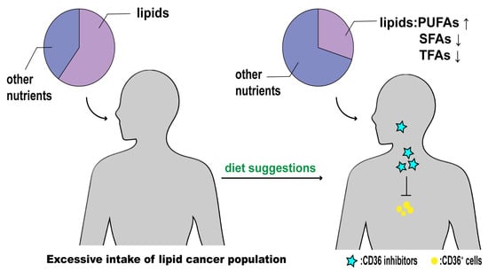 The journey toward effective tumor treatment still has a long way to go. More research targeting CD36 and interfering with FA uptake might be an effective strategy for tumor treatment. In addition to CD36 as a target, controlling dietary lipid intake can be a supplementary therapeutic treatment (Figure 5). Reducing lipid intake and replacing saturated and trans fatty acids with foods rich in polyunsaturated fatty acids can help with tumor treatment. People can incorporate this pattern into their daily diet.