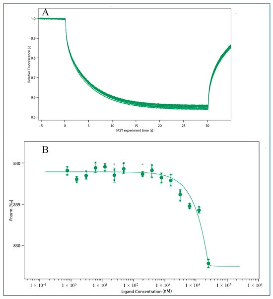 For the first capillary, designate the maximum estrogen concentration (resulting in a final concentration of 1000 nM). Adjust the MST power to 80% for optimal signal strength. Allow the instrument to execute fluorescence detection for 5 s using default settings, followed by a 30 s MST recording. Subsequently, record fluorescence for an additional 5 s to monitor the reverse diffusion of molecules.