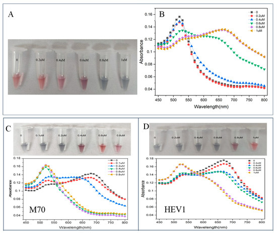(A) Visual observation results of different CNaCl; (B) absorption spectra of different CNaCl. (C) color development and detection spectra after adding different concentrations of M70; (D) color development and detection spectra after adding different concentrations of HEV1.