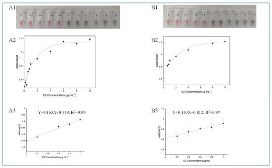 (A) Detecting E2 with M70. (A1) The actual detection diagram, (A2) the relationship diagram between the absorbance ratio A660/A520 of the system and CE2 and (A3) the linear regression curve. (B) Detecting E2 with HEV1. (B1) The actual detection diagram, (B2) the relationship diagram between the absorbance ratio A660/A520 of the system and CE2 and (B3) the linear regression curve.