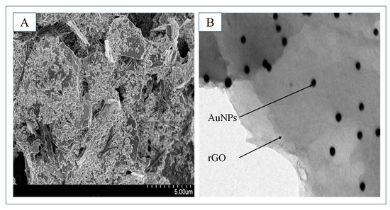 To characterize the synthesized nanocomposites, the nanocomposites modified electrode and the synthesized nanocomposites are characterized via scanning electron microscope (SEM) and transmission electron microscopy (TEM). As shown in Figure 4A, after modification, the electrode surface presents a rough and uneven structure, which effectively increases the specific surface area of the electrode. As shown in Figure 4B, the synthesized nanocomposites are clearly observed. AuNPs are uniformly distributed on rGO without any aggregation phenomenon.