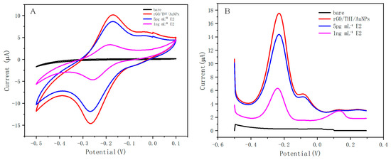 The CV response is shown in Figure 5A. The bare electrode did not exhibit oxidation or reduction behavior when the nanomaterials were not modified, while after modification with the nanomaterials, the working electrode exhibited a good electrochemical response, and a clear redox peak could be observed, which was generated due to the electrochemical activity of thionine. When different CE2 were added, the peak current intensity decreased with increasing CE2, which indicates that the electron transfer from the dielectric to the working electrode was affected by the binding of E2 to the aptamer. This is consistent with our assay principle. The results of CV indicate that the fabrication of this electrochemical sensor was successful.