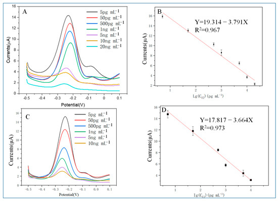 The analytical performance of the aptasensors fabricated through M70 and HEV1 is shown in Figure 6. When CE2 increases, the peak current gradually decreases, and a linear correlation is found.