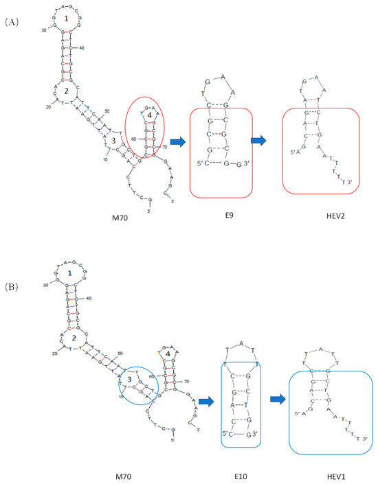 The schematic of short-aptamer modification of E2. (A) Scheme for Cutting M70 Adapters to Obtain HEV2; (B) Scheme for Cutting M70 Adapters to Obtain HEV1.