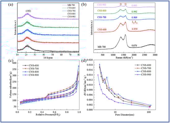 XRD patterns of MB-700, CNS-600, CNS-700, CNS-800, and CNS-900 (a); Raman spectra of MB-700, CNS-600, CNS-700, CNS-800, and CNS-900 (b); the nitrogen adsorption and desorption curves of vermiculite-based template carbon materials calcined at four different temperatures (c); and the pore size distribution curves of vermiculite-based template carbon materials calcined at four different temperatures (d).
