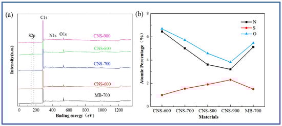 The full spectrum of Figure 2a shows that the five materials are mainly composed of the C, O, N, and S elements. The peak of S2p appears near 166 eV, the peak of C1s appears near 285 eV, the peak of N1s appears near 399 eV, and the peak of O1s appears near 532 eV. The appearance of the oxygen element is mainly derived from the oxygen element contained in the vermiculite. Specific information about the element content is shown in Figure 2b. It can be seen that the nitrogen content continues to decrease with the increase in temperature, while the sulfur element shows an increasing trend, which is also consistent with previous research [28].