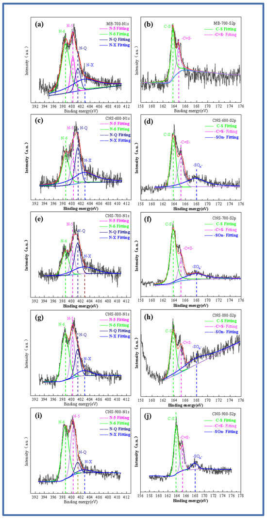 In order to explore the doping state of the nitrogen and sulfur elements, Figure 3a–j show the high-resolution spectrum of the N and S elements. The high-resolution spectrum of N1s shows the binding energy of four peaks. They are located at 398.6 eV, 400.2 eV, 401.3 eV, and 402.7 eV, corresponding to pyridine nitrogen (N-6), pyrrole nitrogen (N-5), graphite nitrogen (N-Q), and pyridine nitrogen oxide (N-X) [29]. With the increase in temperature, the graphite nitrogen content shows an increasing trend, while the other three contents gradually decrease. This is mainly due to the higher thermal stability of graphite nitrogen, resulting in a relative increase in the percentage. After fitting the high-resolution spectrum of S2p, it can be seen that MB-700 pure pyrolytic carbon without a template, unlike the other four template carbon materials, can only fit two peaks of 163.3 and 164.4 eV, which is also consistent with previous studies on methylene blue. As the temperature increases, it can be seen that the S2p peaks of the template carbon materials prepared at four temperatures can be fitted into three peaks, and fitting peaks with binding energies of 163.3 and 164.4 eV correspond to the thiophene-structured sulfur (C-S), (-C=S-) S2p 1/2, and S2p 3/2. Thiophene-structured sulfur helps to improve the defect degree of the material itself and brings more active sites. In addition, the fitting peak, with a binding energy of 168 eV, corresponds to oxidized sulfur (-SOn-), which is mainly caused by the oxygen element between the vermiculite layers. With an increase in temperature, the oxidized sulfur (-SOn-) content also increases. The co-doped nitrogen and sulfur have an obvious synergistic effect, increasing the number of electrochemically active sites on the surface of the carbon materials and improving the charge distribution of active sites.