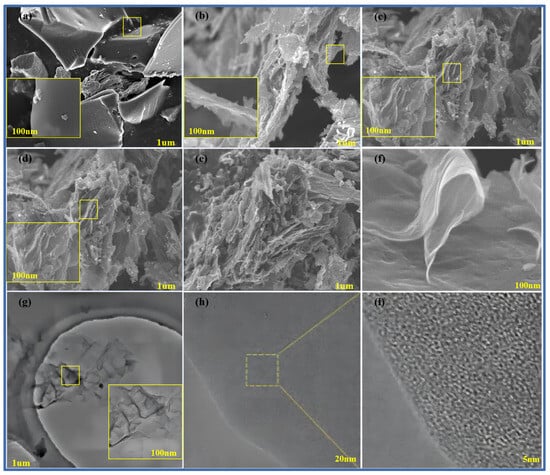 Figure 4a–f show scanning electron microscope images of pure methylene blue carbon materials without a template and pure methylene blue carbon materials (MB-700, CNS-600, CNS-800, CNS-900, and CNS-700) without a template prepared at different temperatures. The small yellow frames in each graph refer to the locally enlarged regions. From the diagram, it can be seen that, compared with the block structure of the methylene blue carbon material control group, without adding the template, the carbon nanosheets prepared at other different temperatures all show an obvious irregular lamellar structure. It can be seen that the carbon nanosheets, after calcination and pickling, more completely inherit the layered structure of the vermiculite template (curly flake), and the surface is relatively smooth. This is also consistent with the results of the previous XRD analysis. In the four groups of carbon materials prepared at different temperatures, it can also be seen that, in the four groups of template carbon materials, the morphology is not much different.