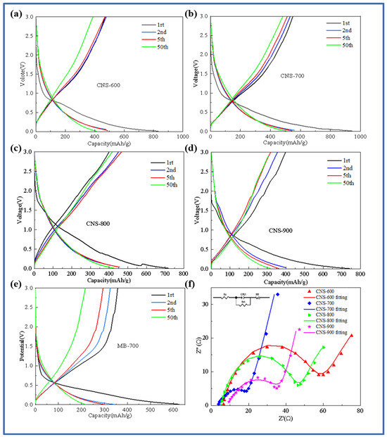 Charge–discharge curves of samples at different carbonization temperatures: CNS-600 (a), CNS-700 (b), CNS-800 (c), CNS-900 (d), MB-700 (e), and AC impedance spectra of samples at different carbonization temperatures (f).