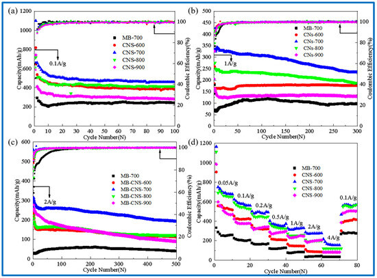 It can be seen that CNS-700 exhibits the best cycle stability. The reversible capacity can still reach 460 mAh/g after 100 cycles at a current density of 0.1 A/g. The reversible specific capacity can reach 300 mAh/g after 300 cycles at a current density of 1 A/g. The reversible specific capacity can still reach 200 mAh/g after 500 cycles at 2 A/g, showing excellent rate performance. This may be due to the relatively large specific surface area, a small number of micropores, and the developed mesoporous structure of CNS-700, and a more ordered and stable graphite-like microcrystalline layer structure is produced at a carbonization temperature of 700 °C.