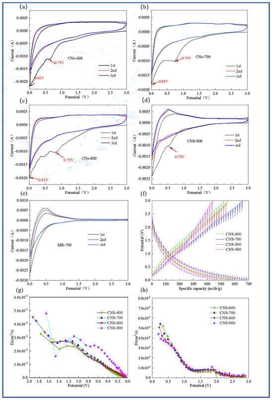 Cyclic voltammograms of four templated carbon materials. CNS-600 (a), CNS-700 (b), CNS-800 (c), CNS-900 (d), and carbon material MB-700 prepared at different calcination temperatures (e); GITT test curve of four template carbon materials in the charging and discharging process (f); lithium-ion diffusion coefficient of four template carbon materials in the discharging process (g); lithium-ion diffusion coefficient curve of four template carbon materials in the charging process (h).