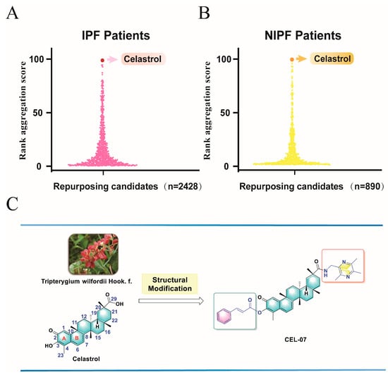 The process of screening and discovering compound CEL-07. (A) The drugs available for IPF treatment screened by cMap. (B) The drugs available for non-IPF treatment screened by cMap. (C) Compound CEL-07 was obtained by structural optimization of celastrol.