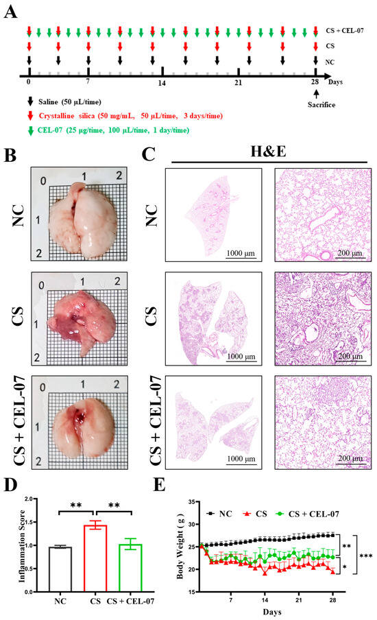 2.1. CEL-07 Inhibits Pulmonary Pathological Damage in CS-Induced Silicosis Mice