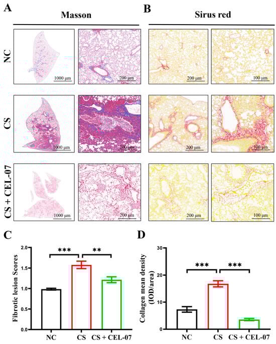 The inhalation of silica particles into the lungs triggers a cascade of events, as these particles are not readily engulfed by macrophages. Consequently, the activated macrophages release various cytokines to stimulate fibroblast activation and proliferation. Simultaneously, the accumulation of extracellular matrix leads to progressive pulmonary fibrosis. To determine whether CEL-07 can improve CS-induced lung fibrosis, we performed Masson staining and Sirius Red staining to assess fibrosis in lung tissues. The results showed that the CS group had significant fibrosis with increased collagen fiber deposition, while the CS + CEL-07 group exhibited reduced fibrosis with decreased collagen deposition (Figure 3A,B). The assessment of fibrotic area and collagen fiber content confirmed that CEL-07 significantly reduced fibrosis in lung tissues (Figure 3C,D). These results indicate that CEL-07 can suppress CS-induced lung fibrosis by inhibiting the production of collagen fibers.