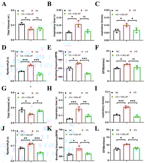 CEL-07 improves respiratory function of silicosis mice. (A–F) Noninvasive plethysmography was used to measure respiratory function parameters, including breathing time, respiratory rate, tidal volume, specific airway resistance, and median expiratory flow rate, on day 14 in different groups of mice. (G–L) Noninvasive plethysmography was used to measure respiratory function parameters on day 28 in different groups of mice. NC: Negative control group; CS: CS-induced group; CS + CEL-07: CEL-07 treatment group. (ns) p > 0.05. (*) p < 0.05. (**) p < 0.01. (***) p < 0.001. Error bars represent mean ± SD.