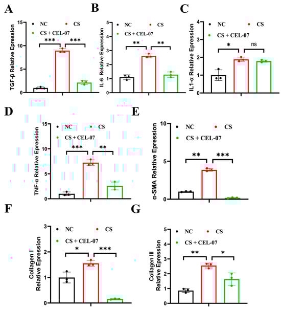 CEL-07 suppresses the expression of inflammatory and fibrotic factors in silicosis mice. (A–G) Real-time PCR analysis of inflammatory factors (TNF-α, TGF-β, IL-6, IL-1α, IL-1β) and fibrotic factors (α-SMA, collagen I, collagen III) in mouse lung tissues. NC: Negative control group; CS: CS-induced group; CS + CEL-07: CEL-07 treatment group. (ns) p > 0.05. (*) p < 0.05. (**) p < 0.01. (***) p < 0.001. Error bars represent mean ± SD.