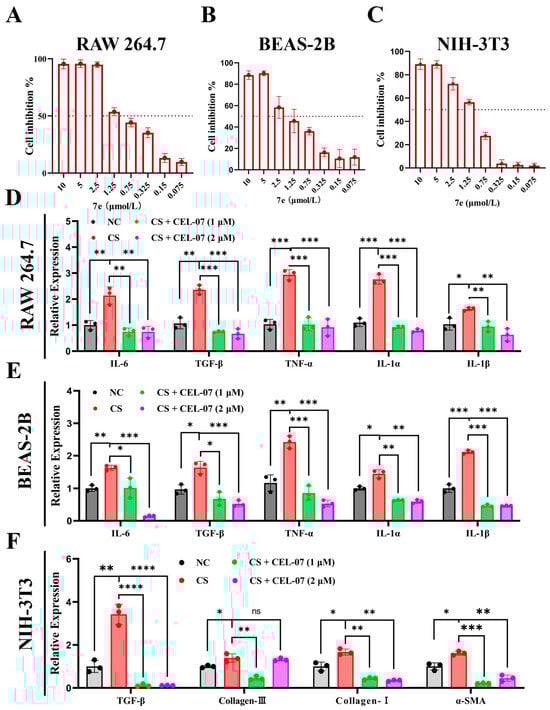 To further investigate the effect of CEL-07 on the expression of inflammatory and fibrotic factors, we constructed CS-induced macrophages (RAW264.7), epithelial cells (BEAS-2B), and fibroblasts (NIH-3T3) and assessed the expression of inflammatory and fibrotic factors. To determine the appropriate dosing concentration of CEL-07 in the three cell lines, we performed a declining-down cell activity assay using the CCK-8 assay, which ultimately determined the dosing concentration to be 1–2 μM (Figure 7A–C). The results of RT-qPCR showed that CEL-07 significantly inhibited the expression of inflammatory factors (IL-1β, IL-1α, IL-6, TNF-α, and TGF-β) in CS-activated RAW264.7 and BEAS-2B (Figure 7D,E). Moreover, the culture medium from CS-stimulated macrophages promoted the expression of fibrotic factors (TGF-β, α-SMA, collagen I, and collagen III) in fibroblasts, while treatment with CEL-07 attenuated their expression (Figure 7F). These results indicate that CEL-07 can suppress the expression of inflammatory and fibrotic factors in vitro.
