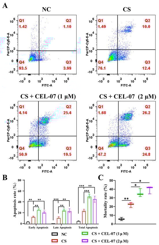 CEL-07 promotes apoptosis of CS-induced fibroblasts. (A) Apoptosis of fibroblasts induced by CEL-07 (2/4 μM) treatment for 24 h. (B) Histogram showing the percentage of apoptotic cells. (C) The number of cell deaths analyzed by trypan blue staining. NC: Negative control group; CS: CS-induced group; CS + CEL-07: CEL-07 treatment group. (*) p < 0.05. (**) p < 0.01. (***) p < 0.001. Error bars represent mean ± SD.