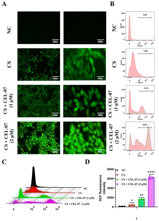CEL-07 promotes fibroblast apoptosis by increasing ROS generation. (A) Fluorescence microscopy analysis of ROS levels in NIH-3T3 cells treated with CEL-07. (B) Flow cytometry analysis of ROS levels in NIH-3T3 cells treated with CEL-07. (C) Comparison of flow cytometry results. (D) Histogram of mean fluorescence intensity of ROS. NC: Negative control group; CS: CS-induced group; CS + CEL-07: CEL-07 treatment group. (*) p < 0.05. (**) p < 0.01. (****) p < 0.0001. Error bars represent mean ± SD.