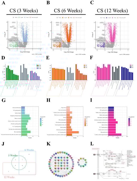 Bioinformatics analysis of the pathogenesis and potential pathways of silicosis. (A–C) Volcano plots showing differentially expressed genes in rats exposed to CS for 3, 6, and 12 weeks compared to the normal group. (D–F) Gene ontology analysis of differentially expressed genes in rats exposed to CS for 3, 6, and 12 weeks. (G–I) KEGG pathway analysis of differentially expressed genes in rats exposed to CS for 3, 6, and 12 weeks. (J) Venn diagram showing the enriched pathways. (K) Protein–protein interaction network of TNF signaling pathway. (L) The adherens junction pathway map of the TNF signaling pathway. Pink rectangles represent target genes involved in inflammation resistance.