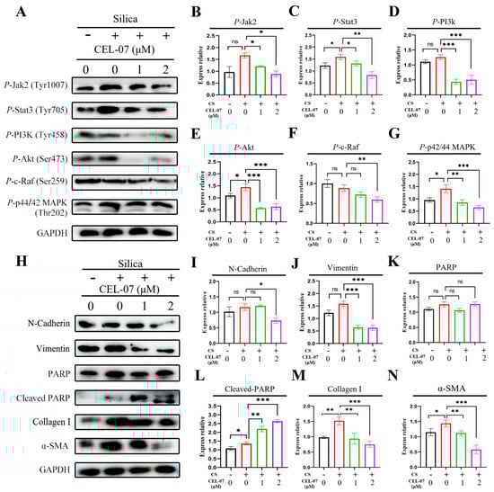 Pathway analysis of CEL-07 in improving silicosis. (A–G) Western blot analysis of phosphorylated proteins in the JAK2-STAT3, PI3K-AKT, and MAPK signaling pathways and quantification of protein expression. (H–N) Western blot analysis of protein expression of N-Cadherin, vimentin, PARP, collagen I, α-SMA, and cleaved PARP and quantification of protein expression. NC: Negative control group; CS: CS-induced group; CS + CEL-07: CEL-07 treatment group. (ns) p > 0.05. (*) p < 0.05. (**) p < 0.01. (***) p < 0.001. Error bars represent mean ± SD.