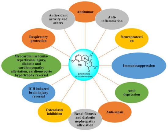 In addition to its recognized anticancer, anti-inflammatory, and neuroprotective effects, SIN and its derivatives have exhibited a range of other biological activities. In 1985, H. Hojo et al. reported that SH, administered at 30 and 100 mg/kg, reduced the anti-sheep red blood cells (SRBC) plaque-forming cells (PFC) response in spleen cells and suppressed the LPS-induced increase in spleen cell numbers. This study highlighted the immunomodulatory potential of SH [170]. Y.W. Chen et al. discovered that SIN, at a concentration of 303.6 µM, diminished the expression of B7-H1 and B7-DC on tubular epithelial cells (TECs) and enhanced IL-2 and IFN-γ production in co-cultured CD4+ T cells. These findings provide insights into the significant immunoregulatory properties of SIN [171]. L. Shu et al. explored the immunosuppressive effect of SIN on CD4+ T cells, demonstrating that SIN, at 0.1 and 1 mM concentrations, induced apoptosis in these cells. The mechanism involved blocking cell cycle progression from the G1 phase to the S phase and enhancing caspase-3 cleavage [172]. Additionally, in 2007, Y.Y. Zeng et al. reported that SIN, administered at doses of 50, 100, and 200 mg/kg, effectively reduced clinical scores and the percentage of initial weight loss in experimental autoimmune encephalomyelitis (EAE). SIN also reduced cellular infiltration, TNF-α, and IFN-γ production in the spinal cord, along with decreasing the CC chemokines RANTES, MIP-1α, and MCP-1. These findings suggest that SIN has therapeutic potential in the treatment of autoimmune disorders like EAE [173].