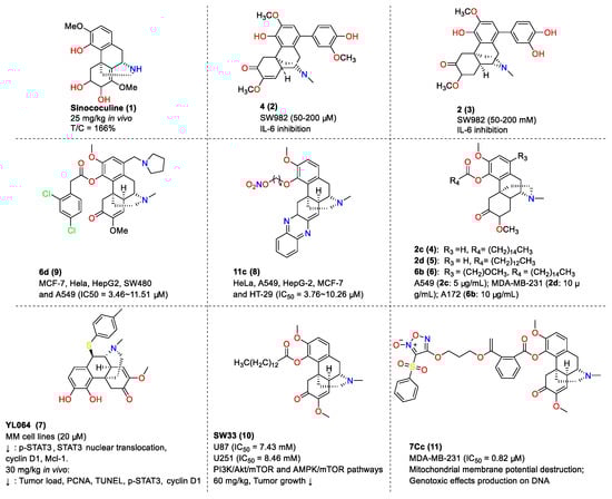 In addition to SIN, numerous SIN derivatives have been investigated for their potential as bioactive agents. Early in 1995, Y.K. Hitotsuyanagi et al. first reported the effectiveness of the SIN derivative sinococuline (1) as an anti-cancer compound at 25 mg/kg (T/C = 166%), with its chemical structure displayed in Figure 7 [60]. Subsequently, two years later, Z. S. Deng’s group found that SIN derivative 4 (2) (50, 100, 200 µM) displayed a superior inhibitory effect on IL-6 production in SW982 cells compared to SIN and other derivatives [61]. Z.S. Deng et al. also reported that SIN derivative 2 (3) exhibited 83%, 95%, and 96% inhibition of IL-6 at a concentrations of 50 mM, 100 mM, and 200 mM, respectively, higher than SIN’s 12% inhibition at 200 mM [62]. Six years later, C.J. Wei et al. completed the synthesis and antitumor evaluation of SIN derivatives modified at the C-1, 4, 7, and 8 positions of SIN. They identified derivatives 2d (5) and 6b (6) with inhibition rates of 79.72% and 84.54% against MDA-MB-231 and A172 cells, respectively, at 10 µg/mL. The inhibition rate of compound 2c was 80.49% against A549 at 8.8 µM, displaying superior antitumor activity compared to the positive control 5-FU [63]. Around the same time, Y.Y. Wang et al. demonstrated that the SIN derivative YL064 (7) selectively induced death in multiple myeloma (MM) cells and primary MM cells by inhibiting STAT3 (Tyr705) at 20 µM. It could bind directly to the SH2 domain of STAT3, inhibiting STAT3 dimerization. At a dosage of 30 mg/kg, it significantly reduced tumor load and affected PCNA, TUNEL, p-STAT3, and cyclin D1 in vivo [64,65].