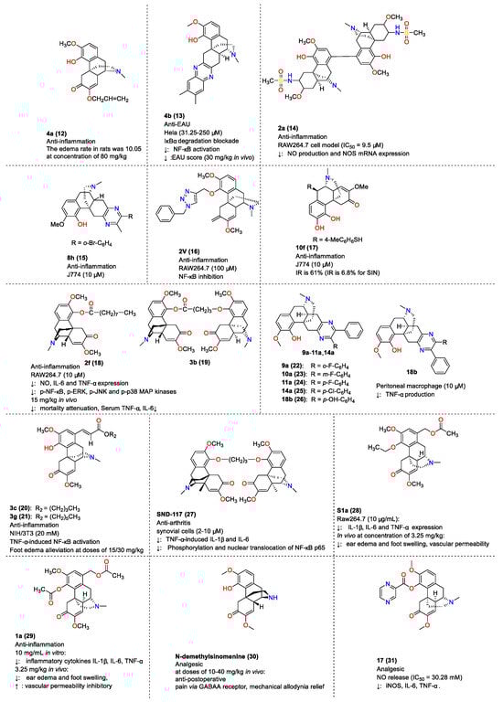 Y.R. Zhou et al. (2015) reported that SIN divalent SND-117 (27) significantly mitigated erythema and swelling in mice, reduced bone erosion and joint destruction, and decreased IL-1β, IL-6, and TNF-α in the knee, besides inhibiting NF-κB-p65. SND-117 also inhibited TNF-α-induced IL-1β and IL-6 expression in a non-cytotoxic concentration range of 2–10 µM [144]. In the same year, Z.J. Zhao et al. reported the anti-inflammatory effects of a novel SIN derivative S1a (28), which significantly reduced IL-1β, IL-6, and TNF-α in Raw264.7 cells and inhibited ear edema and foot swelling in animal models without significant toxicity at concentrations below 20 µg/mL [145]. Subsequently, Z.J. Zhao et al. (2016) demonstrated that SIN derivative 1a (29) showed notable transdermal penetration and anti-inflammatory effects, reducing ear edema and foot swelling in rats more effectively than SIN and other derivatives [146]. Y.T. Ou et al. (2018) reported the anti-pain effect of N-demethyl SIN (30) in post-operative mice, finding that it alleviated mechanical allodynia by targeting the GABAA receptor without significant tolerance [147]. In 2021, Z.Y. Zhou et al. found that N-demethyl SIN (30) attenuated neuropathic and inflammatory pain in mice, which was more effective than that of SIN [148]. F. Gao et al. reported that SIN derivative 17 (31) significantly inhibited the secretion of the pro-inflammatory factor μnitric oxide in Mouse mononuclear macrophage leukemia cells Raw264.7, with an IC50 value of 30.28 µM and no cytotoxic effects at concentrations up to 100 µM [149]. E.E. Shults et al. synthesized SIN derivatives and found that compound 9 (32) significantly reduced pain response when administered at a dose of 2.5 mg/kg [150]. The detailed points of the anti-inflammatory and analgesic activities of SIN derivatives are summarized in Figure 9.