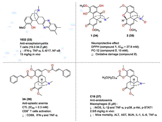 - Yan, L.-C.; Bi, E.-G.; Lou, Y.-T.; Wu, X.-D.; Liu, Z.-D.; Zhou, J.; Wang, Y.; Ma, Z.; Lin, G.-M.; Sun, S.-H.; et al. Novel sinomenine derivative 1032 improves immune suppression in experimental autoimmune encephalomyelitis. Biochem. Biophys. Res. Commun. 2010, 391, 1093–1098. [Google Scholar] [CrossRef] [PubMed]
