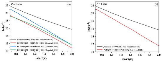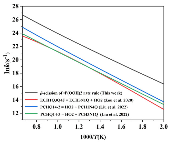 Comparison of the high-pressure limit rate constants: β-scission reaction rate rule of •P(OOH)2 correspond to ECH1Q3Q4J = ECH3N1Q + HO2 in the mechanism from Zou et al. [32], PCHQ14-2 = HO2 + PCH1N4Q and PCHQ14-3 = HO2 + PCH3N1Q in the mechanism from Liu et al. [27], respectively.