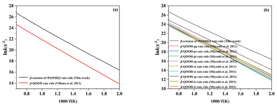 Comparison of the pressure−dependent rate rule derived in this work with the values from the published mechanisms: (a) the combustion mechanism constructed by Zou et al. [32]; (b) the combustion mechanism constructed by Liu et al. [27].