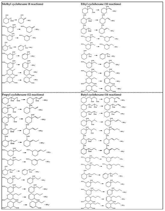 Hydrocarbons can be classified into several major groups, including alkanes, cycloalkanes (also known as naphthenes), aromatics, and alkenes [1]. Cycloalkanes, especially those with C5 and C6 rings, are significant constituents of traditional transportation fuels like diesel and gasoline, accounting for approximately 10 to 30% of their composition [2,3]. They also play a crucial role in jet fuels such as Jet-A/Jet-A1/JP-8 and RP-1, making up a considerable portion of their composition [4,5,6,7]. Based on a comprehensive global study, it has been estimated that mono-, di-, and tri-cycloalkanes collectively constitute approximately 21% of the composition of jet fuel [8]. Recently, there has been growing interest in cyclohexane and related compounds due to the impending depletion of conventional petroleum sources and the ever-increasing prices of fuels. Compared with non-cyclic counterparts such as alkanes, cycloalkanes are more prone to dehydrogenation due to their ring structure, resulting in the formation of unsaturated compounds such as cycloalkenes. These cycloalkenes can be further aromatized to form aromatics. Compared with non-aromatic compounds, aromatic compounds have a higher tendency to form soot during combustion. In addition, the existence of cyclic structures in cycloalkanes is conducive to the formation of polycyclic aromatic hydrocarbons (PAHs). PAHs are large, complex molecules made up of multiple carbon rings fused together. They are highly thermally stable and are considered to be significant contributors to soot emissions [9,10,11]. To mitigate the production of unwanted pollutants and enhance the practical performance of engines, it is crucial to develop detailed combustion models that better represent low-temperature combustion techniques. These models play a crucial role in identifying critical reaction pathways and comprehending the low-temperature oxidation characteristics of large hydrocarbon fuels under different temperature and pressure conditions. This understanding is of immense significance in illuminating ignition phenomena within practical combustion systems like HCCI engines, jet engines, and spark ignition systems [12,13,14,15,16,17].