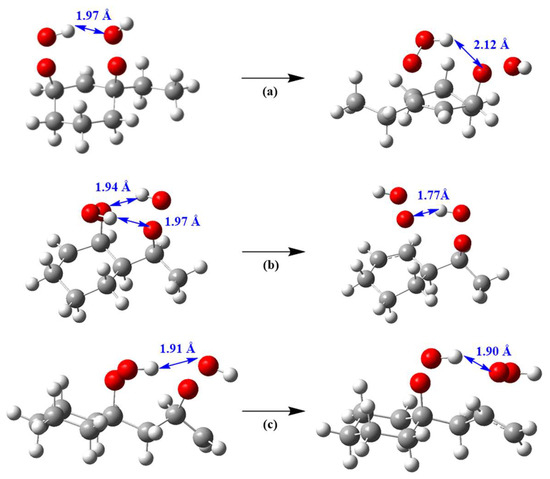 The presence of hydrogen bonds in reactants (left) and transition state (right) for three different scenarios: (a) where both -OOH groups are positioned on the ring; (b) where one -OOH group is situated on the ring and one on the alkyl side chain; (c) where both -OOH groups are placed on the alkyl side chain.
