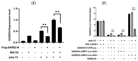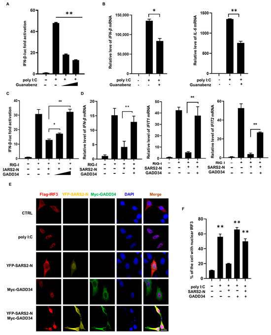 Studies have demonstrated that GADD34 plays a crucial role in the innate immune response, especially in the production of IFN-β to counteract viral infection. Consistently, we found that inhibition of GADD34 by a GADD34-specific inhibitor Guanabenz [39] blocked the poly I:C-induced IFN-β promoter activity and downregulated the levels of IFN-β and IL-6 mRNAs (Figure 3A,B). Therefore, we next investigated the significance of SARS2-N-mediated suppression of GADD34 expression in the innate immune response. As shown in Figure 3C,D, SARS2-N protein significantly suppressed the promoter activity of IFN-β upon RIG-I treatment and downregulated the IFNB1, IFIT1, and IFIT2 mRNA levels stimulated by RIG-I, but enforced expression of GADD34 overcame this inhibitory effect. (Figure 3C,D). This suggests that the SARS2-N protein might suppress GADD34 expression to attenuate the innate immune response (Figure 3C,D).
