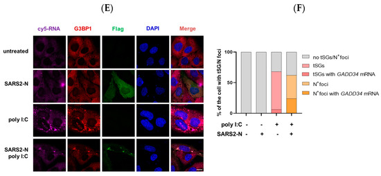 We observed that tSGs were induced in poly I:C-treated 16HBE cells, while the SARS2-N protein remodeled tSGs to N+foci by hijacking G3BP1 [33]. As SGs are closely associated with translational regulation, we next tried to investigate whether G3BP1+ tSGs or N+foci are involved in SARS2-N-mediated inhibition of GADD34 translation. First, we examined the interaction between GADD34 mRNA and the G3BP1 protein using a G3BP1 antibody and performed RNA immunoprecipitation (RIP). As shown in Figure 2A, the recruitment of GADD34 mRNA by G3BP1 was reduced upon poly I:C treatment to induce tSGs but increased by simultaneous overexpression of SARS2-N protein to induce N+foci. The changes in the enrichment of GADD34 mRNA to G3BP1 inversely correlated to the changes in the GADD34 protein (Figure 2B). To verify this, we also overexpressed G3BP1-TurboID fusion protein and performed a TurboID proximity labeling assay. A comparable result was obtained as shown in Figure 2C,D. We next examined the subcellular localization of cy5-labeled GADD34 mRNA and G3BP1 protein. Results of an immunofluorescence assay showed that the majority of GADD34 mRNA was excluded from poly I:C-induced tSGs but co-localized with poly I:C and SARS2-N-induced N+foci (Figure 2E,F). Collectively, these results indicate that the SARS2-N protein promotes the interaction between GADD34 mRNA and G3BP1 protein and isolates GADD34 mRNA to N+foci, leading to the inhibition of GADD34 expression.